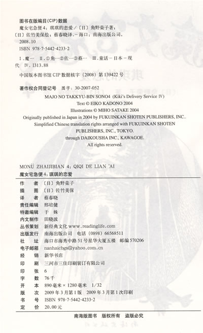 角野荣子,1935年出生于日本东京,早稻田大学教育学院英语文学系毕业,目前居住在神奈川县。曾在出版社工作,1960年前往巴西居住两年,回国后开始绘本和童话创作。著有《尼斯的女婿》《好想吃意大利面》《我的妈妈是阿静》《脑筋急转弯游戏》《花姐姐的客人》《裤子船长的故事》《大盗布拉布拉》《魔女宅急便》等。其中,《裤子船长的故事》获旺文社儿童文学奖,《大盗布拉布拉》获产经儿童出版文化奖大奖,《魔女宅急便》获IBBY优良作品文学作品奖、野间儿童文艺奖、1984年路傍之石文学奖。 佐竹美保,出生于日本富山县,目前居住在东京。最初为科幻卡通画插图,之后进入童书界。主要插画作品有《十五少年流浪记》《梦想农场物语——飞马的翅膀》《宝岛》《封神演义》《魔术师哈鲁和火恶魔》《阿布拉达和飞毯》《这是国王的钥匙》,以及“梅尼姆一家的故事”系列、“雪拉公主的冒险”系列等。