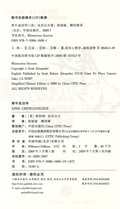 斯科特·亚历山大(Scott Alexander),犀牛成功学专家。23岁时出版《犀牛成功学》,一举成名,至今印刷已超过100次。此后相继出版了《高级犀牛学》、《犀牛相对论》及《犀牛态度》。《犀牛态度》是斯科特用他独特、风趣的风格写成的又一本力作。在这本书里,他进一步阐述了成功必备的态度。目前,犀牛丛书全球畅销近300万册。 今天,斯科特在全世界各地演讲,分享他关于成功与激励独特而幽默的哲学。在过去20年里,他还从事非洲艺术、化石、音乐等不同学科的研究。