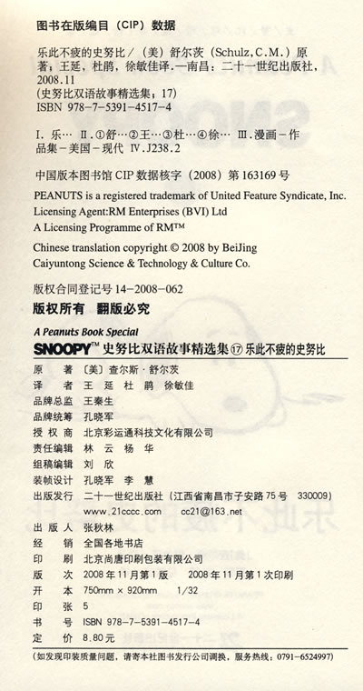 史努比是美国著名漫画家查尔斯·舒尔茨在1905年开始创作的系列漫画。他把真实社会和个人生活体验浓缩在每一个角色中,字里行间蕴含着幽默的人生哲理,其中史努比、查理·布朗等个性鲜明、魅力十足的角色,经久不衰的赢得了世界各国不同年龄层读者的喜爱,引起广大读者的共鸣,并成为美国通俗文化的一部分,创造了漫画史上少有的奇迹。多年来,史努比的足迹已布遍全球75个国家,通过2600多家报纸连载、3亿本漫画、50部动画和数以万计的商品与世人见面,成为世界上最受读者喜爱的漫画之一。本套《史努比双语故事精选集》采用中英文对照的形式,形象地再现了发生在史努比这只小狗与它的主人查理·布朗之间以及其他角色间种种有趣、精彩的小故事。