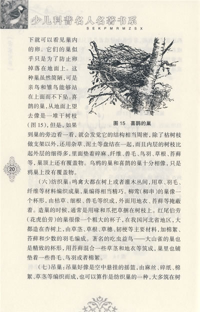 它们筑巢的时间不一样。生活在我国西藏高山上的一种兀鹫,在大自然还被白雪覆盖的时候,就开始筑巢了。这是因为兀鹫的雏鸟发育的时期长,雏鸟在四月孵出,到了九月还留在亲鸟的旁边。雏鸟初生的几个月,正是山问食物最多的时候,这时白雪开始溶化,冬季死去的被压在雪中的动物尸体先后露出地面,成为它们的食物。交嘴雀常在冬季育雏,因为这时候针叶树的种子最多;同时,雏鸟孵出的时候,正是冬末春初,松球里的鳞片正在逐渐裂开,给雏鸟提供了比较方便的取食条件。雀鹰筑巢的习性更有趣。它们的筑巢时间比较晚,雏鸟孵出的期间正是燕雀的雏鸟开始从巢中飞走的时候。因此,雀鹰的雏鸟的主要食物,虽然和燕雀的雏鸟相同,也不会发生争夺。
