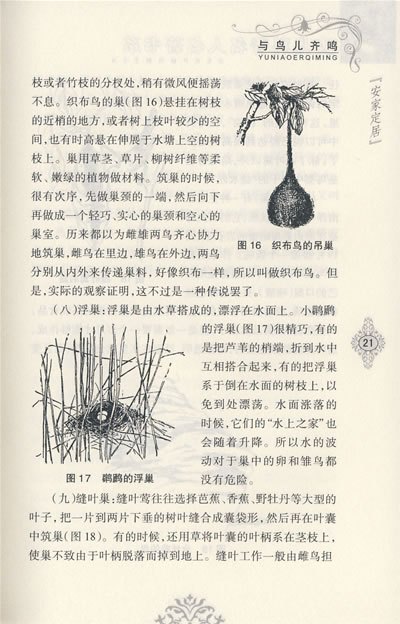 巢是小鸟的摇篮。因此,鸟类只是在产卵和育雏的时期,才住在巢里,平时是不住在巢里的。白天,它们在树林或田野里找食;晚上,就居住在树上或小灌木丛里。
