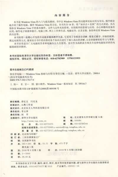 本书是Windows Vista的入门与提高教材,书中以Windows Vista的功能和实际应用为导向,循序渐进地介绍了操作电脑、操作Windows Vista的方法。全书共分14章,用“知识点+实例”的方式讲述,其内容涉及Windows Vista中的基本操作、文件与文件夹的管理、应用程序的管理与应用、办公和数码设备的应用、制作电子相册和影片、电脑上网、网上工作和生活、电脑安全,以及安装、备份和还原Windows Vista的方法等。