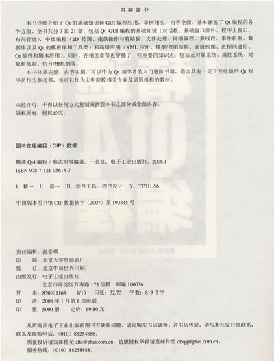 本书体系完整,内容实用,可以作为Qt初学者的入门进阶书籍,适合具有一定开发经验的Qt程序员作为参考书,也可以作为大中院校相关专业及培训机构的教材。