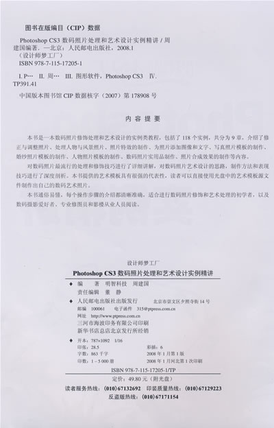 本书是一本数码照片修饰处理和艺术设计的实例类教程,包括了118个实例,共分为9章,介绍了修正与调整照片、处理人物与风景照片、照片特效的制作、为照片添加图像和文字、写真照片模板的制作、婚纱照片模板的制作、人物照片模板的制作、数码照片实用品制作、照片合成效果的制作等内容。