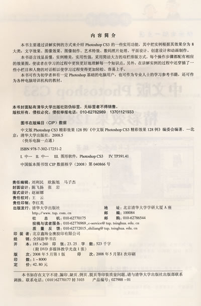 本书主要通过讲解实例的方式来介绍Photoshop CS3的一些实用功能,其中把实例根据其效果分为8大类:文字效果、图像效果、图像制作、艺术特效、数码照片处理、平面设计、创意设计和动画制作。