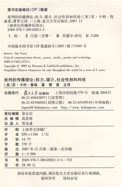 苏·卡利·詹森(Sue Curry Jansen),美国宾州Muhlenberg Colleges传播学教授,国际著名批判传播理论学者,代表作有《新闻检查:权力与知识的扭结》(Censorship:The Knot that Binds Power and Knowledge,1988)和《批判的传播理论:权力、媒介、社会性别和科技》(Critical Communication Theory:Power,Media,Gender,and Technology,2002)。