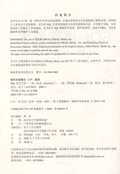 《SQL语言艺术》的作者St6phane Faroult借用《孙子兵法》的智慧处理SQL性能方面的问题。开发数据库应用好比一场战役,设计即战略,而每次数据库访问就是与敌军在战术上的对决。