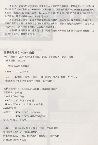 本书以人量的实例全面介绍了文秘工作人员需要握的扦种计算机功能。个书共分14章,涵盖了文秘工作概述、WindowsXP摹本操作、常用输入法简介、Office主要组件的基本知识与高级应用、办公局域网与Intemet、电子邮们:的使用、常用的办公设备与办公软件、电子商务、计算机系统的安全和维护等知识。