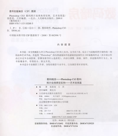 本书是一本专供摄影人学习Photoshop CS3的工具书。全书共5章,综合了当前数码照片制作的一些技法和艺术手法,并选用“Photoshop”的内置滤镜和外挂滤镜创意制作出100幅数码作品(其中部分作品已在近年全国影展、影赛及报刊中入选获奖),内容以调整、拼接、制作、创意数码照片为主。本书易懂易学,学用结合,图文并茂。