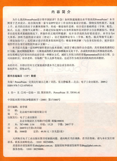 为什么我的PowerPoint设计得不到好评?告急!如何快速地做出水平很高的PowerPoint?本书侧重于艺术设计,结合国内第一家专业PPT设计工作室的实案设计经验,围绕实用性展开,迅速上手。此书的目的在于从整体到细节,形成一整套制作思维,结合设计基础理论(字体、配色、版式,以及一些细节元素等),并通过实际案例与自身所需制作比对的学习方法掌握技巧,使读者在没有美术基础的情况下,所制作的文稿同样精彩。而并非浮浅的为好看而设计。本书分为4大体系:剖析当前的设计误区(理论);设计基础理论导入(字体,配色,版式,细节元素等)(理论加技巧);幻灯演示设计的基本原则和技巧;整案事例讲解(与自身实际结合,逐步设计制作符合自身行业特征的演示文稿)。