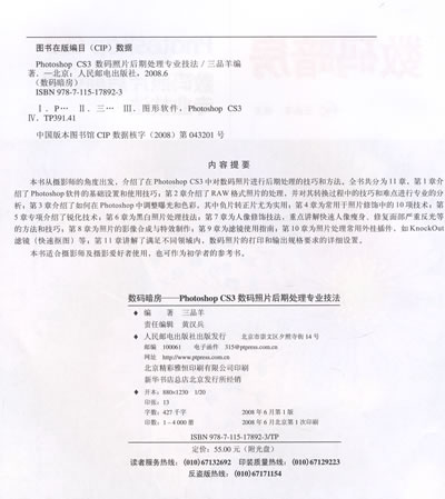 本书从摄影师的角度出发,介绍了在Photoshop CS3中对数码照片进行后期处理的技巧和方法。全书共分为11章,第1章介绍了Photoshop软件的基础设置和使用技巧;第2章介绍了RAW格式照片的处理,并对其转换过程中的技巧和难点进行专业的分析;第3章介绍了如何在Photoshop中调整曝光和色彩,其中负片转正片尤为实用;第4章为常用于照片修饰中的10项技术;第5章专项介绍了锐化技术;第6章为黑白照片处理技法;第7章为人像修饰技法,重点讲解快速人像瘦身、修复面部严重反光等的方法和技巧;第8章为照片的影像合成与特效制作;第9章为滤镜使用指南;第10章为照片处理常用外挂插件,如KnockOut滤镜(快速抠图)等;第11章讲解了满足不同领域内,数码照片的打印和输出规格要求的详细设置。