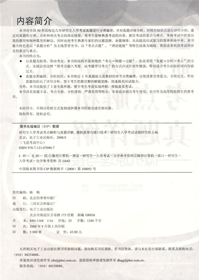 本书对微机相关的基础知识、8086系统结构、汇编语言基础、汇编语言程序设计、存储器、微型计算机中断系统、可编程计数器定时器及其应用、模数A/D和数模D/A转换、PC的结构和组成等知识点的考研题目做了详尽地讲解,帮助读者有针对性地提高自己的微机原理与接口技术。
