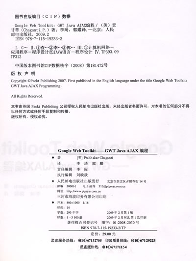 本书是一本使用Java创建AJAX应用的GWT实用指南,从下载和安装GWT开始,手把手教读者如何创建、测试、调试和部署GWT应用。本书采用了许多生动有趣的示例,引导读者逐步深入到AJAX和GWT的精彩世界中。书中提供的所有例程源代码均可在我社网址http://www.ptpress.com.cn的“资源下载”区免费下载并直接运行。