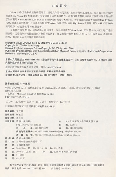 全书共六部分30章,结构清晰,叙述清楚。所有练习均在Visual Studio 2008简体中文版上进行过全面演练。无论是刚开始接触面向对象编程的新手,还是打算转移到C#的具有C,C++或者Java基础的程序员,都可以从本书中吸取到新的知识。