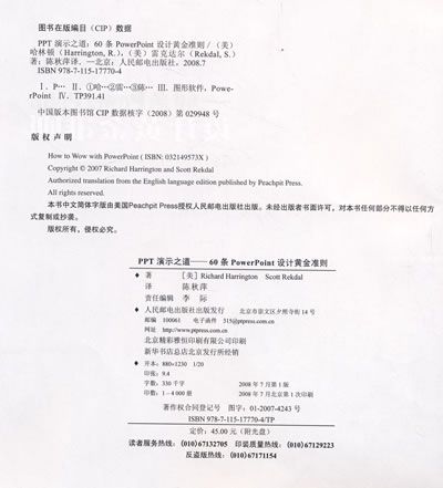 本书以全新的阐述方式将PowerPoint设计法则归为七大类,每类中包含若干精彩实用的黄金法则。书中以PowerPoint 2007为例,首先介绍了至关重要的排版、版式和设计,然后阐述了如何创建表格、图表、图形和自定义模板,接下来讨论了如何在演示文稿中加入音频、视频和Flash等有趣的内容,最后讨论了导出和发布,包括如何创建讲义、上传到网站及其他共享演示文稿的方式。