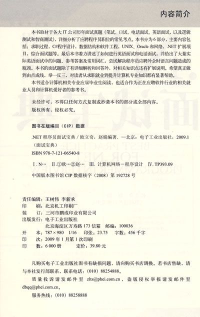 本书取材于各大IT公司历年面试真题(笔试、口试、电话面试、英语面试,以及逻辑测试和智商测试),详细分析了应聘程序员职位的常见考点。本书分为6部分,主要内容包括:求职过程,C#程序设计,数据结构和软件工程,UNIX、Oracle和网络,.NET扩展项目,综合面试题等。最后本书着力讲述了如何进行英语面试和电话面试,并给出了大量实际英语面试中的问题、参考答案及常用词汇,尝试解决程序员应聘外企时语言问题造成的瓶颈。本书的面试题除了有详细解析和回答外,对相关知识点还有扩展说明。希望真正做到由点成线,举一反三,对读者从求职就业到提升计算机专业知识都有显著帮助。