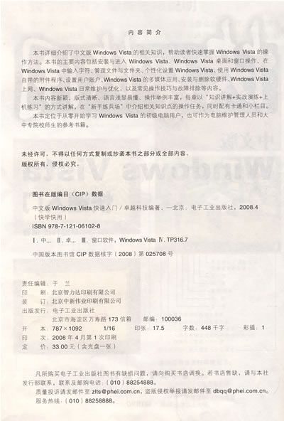 本书定位于从零开始学习Windows Vista的初级电脑用户,也可作为电脑维护管理人员和大中专院校师生的参考书籍。