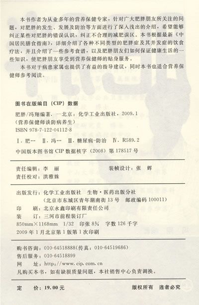 本书作者为从业多年的营养保健专家,针对广大肥胖朋友所关注的问题,对肥胖的发生、发展及防治等方面进行了深入浅出的介绍,希望能够纠正某些对肥胖的错误认识,纠正不合理的减肥误区。本书根据最新《中国居民膳食指南》,详细介绍了各种不同类型的肥胖症及其并发症的饮食疗法,并且介绍了一些参考食谱,以及肥胖朋友们如何保证健康生活的一些知识,使肥胖朋友享受到营养保健师的贴身服务。