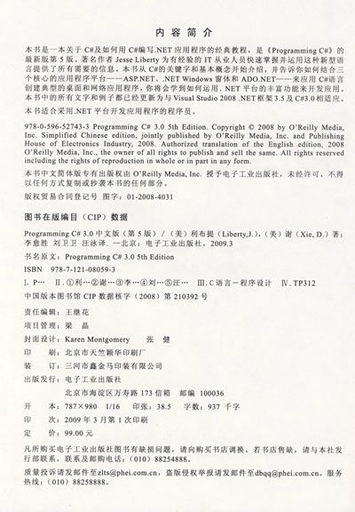 本书是一本关于C#及如何用C#编写.NET应用程序的经典教程,是《Programming C#》的最新版第5版。著名作者Jesse Liberty为有经验的IT从业人员快速掌握并运用这种新型语言提供了所有需要的信息。本书从C#的关键字和基本概念开始介绍,并告诉你如何结合三个核心的应用程序平台——ASP.NET、.NET Windows窗体和ADO.NET——来应用C#语言创建典型的桌面和网络应用程序,你将会学到如何运用.NET平台的丰富功能来开发应用。本书中的所有文字和例子都已经更新为与Visual Studio 2008 .NET框架3.5及C#3.0相适应。