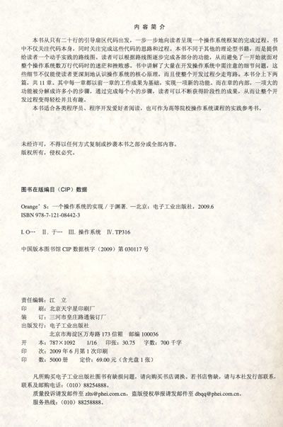 立足实践层面,关注动于操作过程中的细节,一步一步熟读者完成自己的操作系统:最简单的Boot Sector-由Boot Sector和Loader加载的内核-实现一个和多个进程-多控制台-进程间通信-轻巧的FS-简单的MM-自己的C运行时库-运行自己的应用程序-在真机进行自己操作系统。