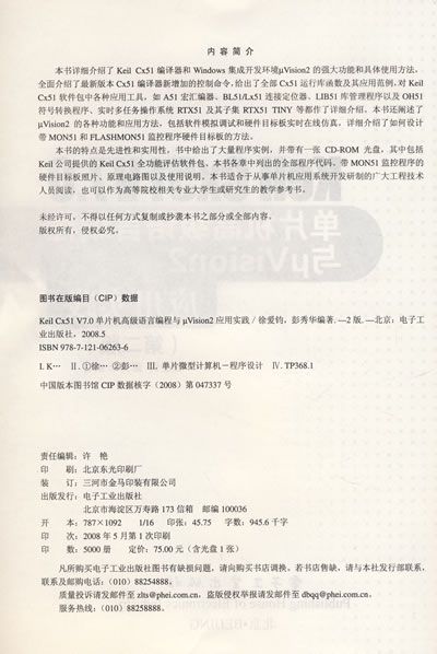 本书共分12章,第1章阐述8051单片机的存储器结构,以及在μVision2集成开发环境下进行Cx51程序设计和编译调试的基本方法。第2章到第6章阐述8051单片机C语言编程的基础知识,以及Keil Cx51对ANSI C的扩展。第7章阐述μVision2集成开发环境,详细介绍了工作环境、目标程序的仿真调试以及各种开发工具应用选项的设置方法。第8章阐述在μVision2环境下进行Cx51应用程序设计的技巧,通过大量具体实例详细讨论了许多Cx51实际应用中的常见问题和解决方法,详细介绍利用MON51监控程序设计用户硬件目标板的方法。第9章介绍Keil Cx51编译器的各种编译控制命令、数据调用协议,给出了全部库函数及其应用范例。第10章阐述A51宏汇编器,介绍了各种符号与表达式、汇编伪指令、宏处理以及汇编控制命令。第11章阐述BL51/Lx51连接定位器与实用工具,详细介绍BL51/Lx51的各种连接控制命令、符号转换程序OH51、库管理程序LIB51的使用方法。第12章阐述RTX51实时多任务操作系统及其子集RTX51 TINY的功能和具体使用方法。