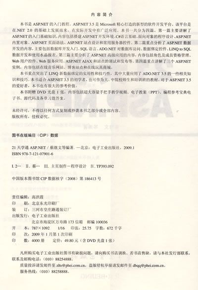 本书是ASP.NET的入门教程。ASP.NET 3.5是微软精心打造的新型的软件开发平台。该平台是在.NET2.0的基础上发展而来,在实际开发中有广泛应用。本书一共分为四篇,第一篇主要讲解了ASP.NE的入门基础知识,内容包括搭建ASP.NET开发环境、C#语言基础、面向对象的程序设计、ASP.NET内置对象、ASP.NET页面语法、ASP.NET站点设计和常用服务器控件。第二篇重点分析了ASP.NET数据开发的内容,主要包括数据库开发入门、SQL语言、ADO.NET对数据库访问、数据绑定控件、LINQ to SQL数据开发和使用水晶报表。第三篇主要分析了ASP.NET高级应用的内容,包括角色及成员资格管理、Web用户控件、Web服务应用、ASP.NET AJAX和站点的调试和发布等。第四篇ASP.NET实例开发篇重点讲解了三个ASP.NET实例,包括在线音乐网站、博客站点和在线玩具商城。