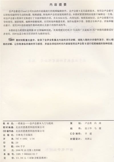 会声会影是Ulead公司出品的目前最流行的视频编辑软件,会声会影9是其最新版本。使用会声会影可以轻松创建带有生动的标题、视频滤镜、转场和声音的家庭视频作品。本教材紧紧围绕家庭影片编辑这一主线,对会声会影9简体中文版进行了全面详细的介绍,并从实际出发。内容包括:视频基础知识、会声会影影片向导的使用、捕获视频、编辑和修整视频、应用转场和覆叠效果、制作标题和字幕、修整音乐和声音、渲染和输出影片、使用DVD拍拍烧制作数码相册以及影片的制作流程等。