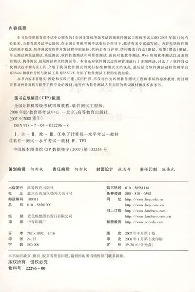 本书内容丰富翔实,理论和实践并重,实用性强,不仅可作为四级软件测试工程师考试的标准教材,而且可用作高校计算机与软件工程专业的教材,也可作为软件测试人员实用的培训教材和技术参考书。