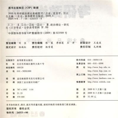 三、《2010年考研政治理论冲刺串讲及时政热点》编写特点:考点、难点、重点精准标注。考生们经过近一年的复习,对基础知识的掌握相对牢固,但会出现条理不清、抓不住重点的现象。本书针对这一状况,将政治理论课程繁杂的知识点,以清晰的条理和简洁的语言表述出来,旨在节省考生们的宝贵时间;同时将考试要求时间段内的时政热点问题整理成册,以此弥补以往政治理论冲刺阶段复习备考用书将串讲内容与时政内容分割开来的弊端,合二为一,方便广大考生复习备考。