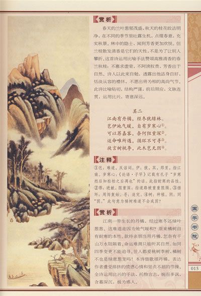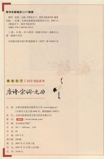 本书精选了中国古典文学中的近六百首优秀诗歌,并配以名家丹青,希望能将文学艺术与绘画艺术和谐地融汇在一起,使文字与图画互有生发,相得益彰,使读者真正感受到“诗情画意”之美。本书所选篇目以普及性为要,唐诗以清蘅塘退士选编的《唐诗三百首》为基础,挑选可接受性强、浅近明白之作入书,又广泛借鉴了其他的权威版本。宋词和元曲的选择则是在广泛借鉴其他版本的基础上,对各个时期各种题材的作品衡量斟酌,博采众家之长。元曲包括元散曲和元杂剧,元杂剧文学成就也很高,但我们只选了活泼灵动、浅俗直白、使欣赏者毫无间隔感的元散曲。