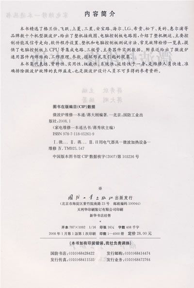 本书集代表性、资料性、实用性、权威性、系统性、延续性于一身,是维修人员快速、准确排除微波炉故障的良师益友,也是微波炉设计人员不可多得的参考资料。