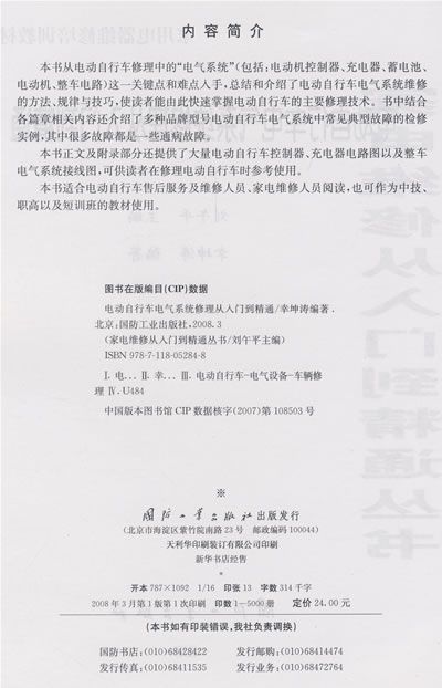 本书就是针对电动自行车维修中“电气系统”这一关键点和难点,总结电动自行车“电气系统”维修的规律与技巧,使读者快速掌握电动自行车维修技术而编写的。 按照由浅入深、循序渐进的原则,本书分为三篇:入门篇——从电动自行车结构和组成入手,介绍电动自行车机械结构以及机械部分最为常见故障的检修方法。提高篇——在入门篇的基础上,介绍电动自行车电气系统检修的知识和方法,重点介绍电动自行车中使用的有刷直流电动机、无刷直流电动机和电动自行车用蓄电池以及故障修理等内容。精通篇——主要介绍各种典型电动自行车控制器、充电器的原理与检修;电动自行车整车电气系统故障的检修;电动自行车电气系统典型故障的检修方法及技巧等内容。