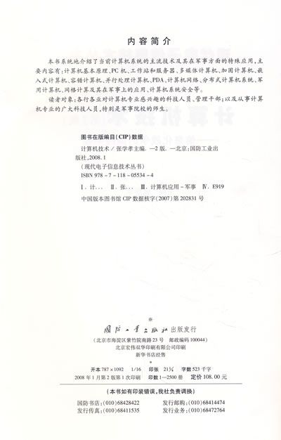 本书系统地介绍了当前计算机系统的主流技术及其在军事方面的特殊应用,主要内容有:计算机基本原理、PC机、工作站和服务器、多媒体计算机、加固计算机、嵌入式计算机、容错计算机、并行处理计算机、PDA、计算机网络、分布式计算机系统、军用计算机、网格计算机及其在军事上的应用、计算机系统安全等。