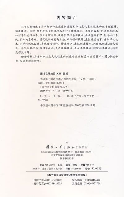 本书主要论述了军事电子行业先进制造技术中信息化支撑技术和数字化设计、制造技术。同时,对先进电子制造技术进行了精辟描述。主要内容有:先进制造技术的信息化支撑体系,项目管理系统,设计管理信息化技术,企业资源管理,制造执行系统,客户关系管理。现代设计理论与方法,产品创新设计,虚拟现实技术,虚拟样机技术,多学科优化设计,异地协同设计。精益生产,虚拟制造技术,网络化制造,绿色制造。电气互联技术,微组装技术,先进连接技术,表面工程技术,精密加工技术,精密成形技术等。