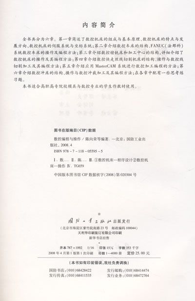 全书共分为六章。第一章简述了数控机床的组成与基本原理、数控机床的特点与发展方向、数控机床的伺服系统与坐标系统;第二章介绍数控车床的结构、FANUC(法那科)系统数控车床的操作及编程方法;第三章介绍数控镗铣床和加工中心的结构,详细介绍了数控铣床的操作及其编程方法;第四章介绍数控快走丝线切割机床的结构、操作与数控线切割加工及其编程方法;第五章介绍应用MasterCAM系统进行数控加工编程的方法;第六章介绍数控冲床的结构、操作与数控冲栽加工及其编程方法;在各章中配有一些思考练习题。