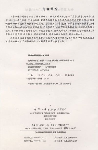 本书以通俗的语言介绍了物理原理与工程技术的关系,介绍了力学、热学、电磁学、光学、相对论、原子物理、半导体物理、凝聚态物理等知识及其在工程技术中的应用。特别强调物理知识在现代高新技术中的应用。全书分为15章,包括:力学原理与工程技术、流体力学与流体机械、机械波与声学技术、热能与动力、电磁理论与电磁技术、电磁波与无线电技术、半导体物理与微电子技术、传统光学技术、现代光学技术、物理效应与传感技术、真空技术及其应用、能源技术、现代测试技术、高能物理与加速器、新型功能材料。