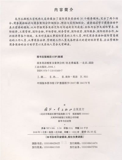 本书从微观与宏观两大层面囊括了国际商务英语的30个精要模块,突出了两个结合:商务英语知识与商务案例分析相结合,理论与实际相结合。读者通过学习商务活动中真正需要的模块,从而掌握商务英语交际与沟通的实用技能,具体内容涉及国际贸易、国际经济、工商管理、国际金融、市场营销、财务管理、国际投资、国际服务、国际经济合作、知识经济等各个领域。本书对直接从事国际贸易的工作人员、研究商务英语和国际贸易理论的工作人员、从事商务法律、管理的工作人员及各种层次的爱好经济贸易、企业管理和 商务英语的全日制学员以及其他人员会大有裨益。