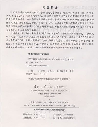 全书共分13个单元,主要涉及“新产品开发策略”、“国际产品规划与开发”、“营销规划与渠道”、“B2B市场”、“服务、非盈利营销与社会”、“广告宣传与公共关系”、“人员推销与销售管理”、“网上营销与新媒体”、“直销、会展与交易会”、“营销与社会”、“服务营销” 等内容。本书适于作高等院校英语、外贸英语、商务英语、国际营销、国际贸易、国际经济管理等专业的英语教材,也是从事国际营销的人员提高英语水平的重要参考书。