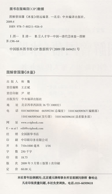 曾国藩在中国近代历史上的确起过引人注目的作用。他潜心研究学问,留下过许多值得后人汲取的养份,他面对现实,奏陈时弊,成为晚清王朝的柱石人物;他招兵买马,编练“湘军”,镇压太平天国革命,是晚清王朝的“中兴名臣”;他在一定条件下顺应历史潮流、倡导洋务,为中国的进步作出了贡献。在知人善任、教育子女等方面,曾国藩的确作出了令世人称道的业绩。 《曾国藩冰鉴》即其鉴人专著,取以冰为镜,能察秋毫之义。体虽小而思精,言虽少而意深,其鉴人观人之法的今天亦有重要的实用价值。