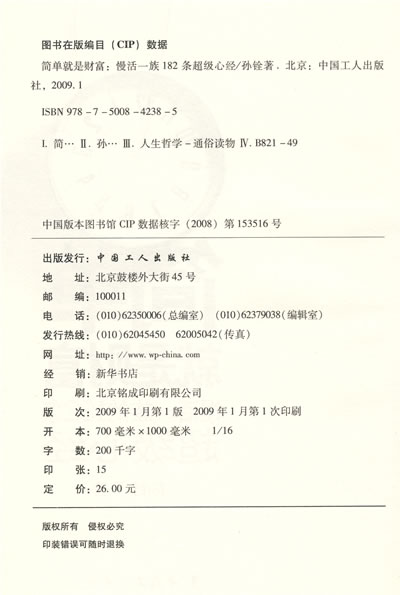 简单的需求,简单的人际交往,简单的生活方式,简单的工作状态。贝聿铭曾经说:最美的往往是最简单的。简单是一杯清茶,淡然中透着清香,身清爽,心恬静;简单是一把钥匙,打开幸福之门,屏蔽繁乱的世事和烦躁不宁,充实纯粹,自得自在;简单是一首诗,纯粹中感受生活的雅致和隽永;其实简单更是一笔财富。本书倡导的简单做人、简单做事的理念与方法,在现如今这个人人活得很累、精神压力与日俱增的社会中,不失为自我调整心态、把握最佳人生道路的方式之一。