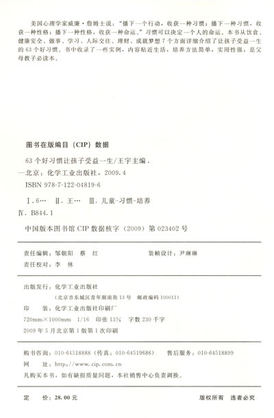 美国心理学家威廉·詹姆士说:“播下一个行动,收获一种习惯;播下一种习惯,收获一种性格;播下一种性格,收获一种命运。”习惯可以决定一个人的命运。本书从饮食、健康安全、做事、学习、人际交往、理财、成就梦想7个方面详细介绍了让孩子受益一生的63个好习惯。书中收录了一些实例,内容贴近生活,培养方法简单,实用性强,是父母教子必读本。