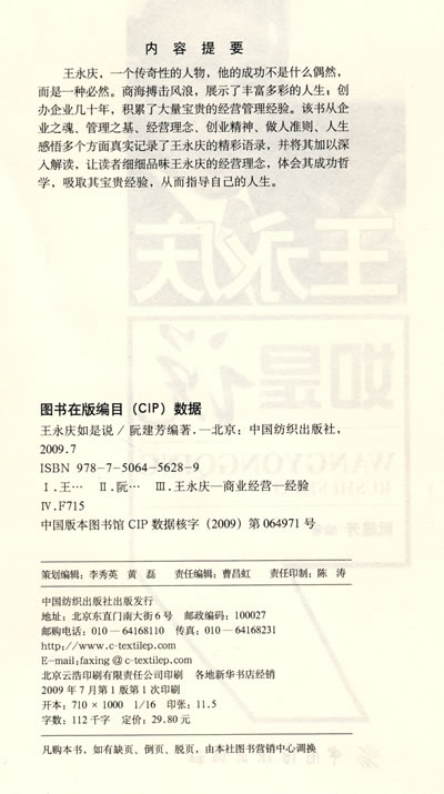 王永庆,一个传奇性的人物,他的成功不是什么偶然,而是一种必然。商海搏击风浪,展示了丰富多彩的人生;创办企业几十年,积累了大量宝贵的经营管理经验。该书从企业之魂、管理之基、经营理念、创业精神、做人准则、人生感悟多个方面真实记录了王永庆的精彩语录,并将其加以深入解读,让读者细细品味王永庆的经营理念,体会其成功哲学,吸取其宝贵经验,从而指导自己的人生。