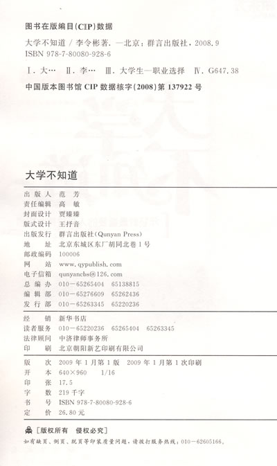 本书是作者几年来为前途困惑的青年做人生咨询的一个总结,也许稚嫩,但我认为绝不流俗。跟一般的指导书不一样,书中的文字有一种鲜明的批判性,对传统教育做了较为深刻的反思。并且提出了“问题青年”这样一个概念,作为传统教育下培养的“答案青年”的一个出路。有人问,人生可以咨询吗?答案是肯定的。我们中有些人是天生就有方向感的,也许这些人自己能够认识道路;但大部分人都有过迷路的经历,在迷路的时候,只需要有一个人告诉我们方向,或有一个标牌指明方向就行;也许这个人和这个标牌很普通,但指出的方向对于行路人来说却十分重要。也许这就是这本书和李令彬这样的人存在的意义。 ——俞敏洪 我在新东方做咨询十几年,由于新东方巨大商业培训的支撑,我能够刻意不把我的咨询商业化,我的“免费咨询”为新东方赢得了巨大商誉。但缺点之一,也就无法招揽优秀青年加入我的咨询队伍。做来做去,只有我这个独行侠孤军奋战,这成为我这份有意义工作的最大遗憾。Robin的出现,弥补了我的这个叹息。由于他的认可,专注,对咨询事业的喜爱,他毫无悬念地、当之无愧地成为我唯一精心培养的专业咨询者,而且是已经得到了众多新东方学生、当代青年赞同,认可的专业咨询者!……所以,我前所未有地对Robin的成长和职业生涯承担了一种责任,不断鼓励和帮助他在青年咨询事业里努力思考、学习、实践、积累……慢慢地,Robin成了新浪教育博客里的名博,成了教育和职业咨询领域里的新秀,成了这个领域的优秀专家,成了可以代替我解决绝大多数人问题的可信可靠的咨询师。 ——徐小平 人生的问题是无穷无尽的,每个人都会遇到独特的成长困境,如果通过我的咨询实践,不仅能满足更多“答案青年”的现成需要,而能把更多的优秀青年变成“问题青年”,开启他们提出问题的意识,改善他们解决问题的能力,引导他们走向新的探索,那么我的“人生咨询”才算是有了一点建设性的意义,也不枉在江湖上浪得虚名! ——李令彬[Robin]