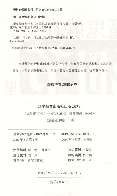 细节致胜:细节并非随时要保持露八颗牙齿的微笑、鞠躬、伸手引路等规范化的行为,它是能够让你与众不同、获取好印象、最后通向成功的细小环节。职场新人成长攻略,办公室生存另类法则!不管你是菜鸟新人,还是高阶管理者,它都是让你受益无穷的全方位职场胜经!