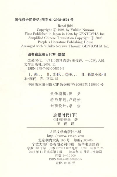 野泽尚,一九六○年生于日本爱知县。一九八三年从日本大学艺术系毕业后,便以过人的才华得到了“城户奖”,成为当年最受瞩目的新人剧作家之一。之后创作了《恋人啊》、《青鸟》等作品,后因《沉睡的森林》、《冰之世界》两部日剧的大获成功,成为日本最著名的剧作家。曾获得日本学院奖、吉川英治文学新人奖、江户川乱步奖等大将。《恋爱时代》获第四届岛清言情文学奖,同名韩剧引起极大反响。二00四年六月二十七日去世。