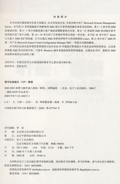 本书由两位微软最有价值专家编写,从实用角度出发,全面详细介绍了Microsoft Systems Management Server。本书用21章的篇幅集中讲解使用SMS进行日常管理的操作和常见的范例。第1~3章介绍SMS的基础内容;第4~7章介绍服务器与客户端的部署配置相关内容;第8~15章按照SMS的功能分章节的详细介绍了每个功能;第16~19章介绍了日常维护管理方面的一些内容;本书的20章介绍了Quest公司基于SMS的扩展组建,它可以通过SMS来管理异构平台的系统例如Linux;第21章介绍了SMS的新一代产品Microsoft System Center Configuration Manager 2007一些相关功能的概述。