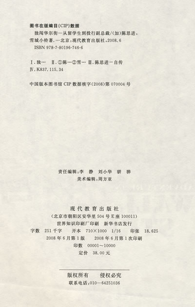 陈思进,纽约大学金融专业进修班结业,纽约市立大学电脑科学硕士。1994年10月进入华尔街,曾任银行家信托风险管理部金融软件开发分析师、纳斯达克所属的BRUT ECN高级金融软件工程师、瑞士信贷(CreditSuisse)证券投资部助理副总裁、美洲银行证券公司(Bane of America Securities)副总裁。目前定居加拿大多伦多,任加拿大宏利金融财团(Manulife Fmancial Corp.)全球投资部资深顾问,负责全球电子证券交易系统的开发与管理。《读者》签约作家、《北京青年报》和“金融界”网专栏作家、《海外文摘》2007年最佳作者。
