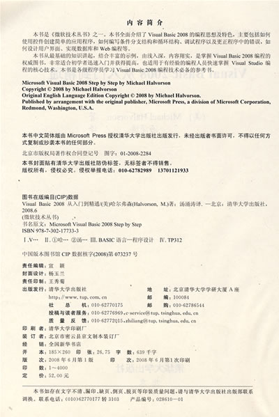 本书从最基础的知识讲起,结合丰富的示例,由浅入深,内容翔实,是掌握Visual Basic 2008编程的权威图书,非常适合初学者迅速入门并获得提高,也适用于有经验的编程人员快速掌握 Visual Studio编程的核心技术。本书是各级程序员学习Visual Basic 2008编程技术必备的参考书。
