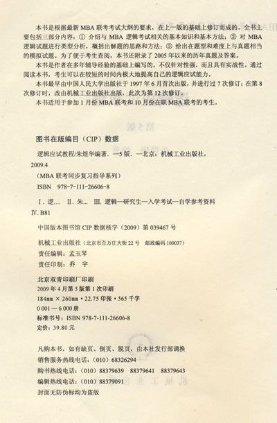 本书是根据最新MBA联考考试大纲的要求,在上一版的基础上修订商成韵。全书主要包括三部分内容:①介绍与MBA逻辑考试相关的基本知识和基本方法;②对MBA逻辑试题进行类型分析,概括出解题的思路和方法;③给出在题型和难度上与真题相当的模拟试题。为了便于考生查阅,本书还附录了2005年以来的历年真题及答案。