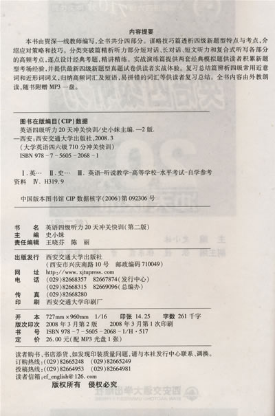 本书由资深一线教师编写,全书共分四部分。谋略技巧篇透析四级新题型特点与考点,介绍应对策略和技巧。分类突破篇精析听力部分短对话、长对话、短文听力和复合式听写各部分的高频考点,逐点设计经典考题,精讲精练。实战演练篇提供两套经典模拟题供读者积累新题型考场经验,并提供最新四级新题型真题试卷供读者实战体验。复习总结篇辨析四级常用近意词和近形词词义,归纳高频词汇及短语,易拼错的词汇等供读者复习总结。全书内容由外教朗读,随书附赠MP3一盘。